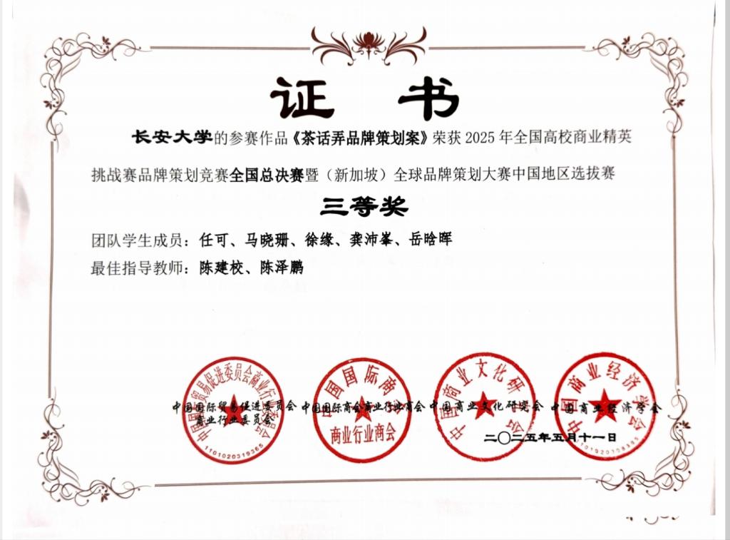 近日,2025年全国高校商业精英挑战赛品牌策划竞赛全国总决赛比赛结果揭晓,由太阳成集团tyc33455陈泽鹏老师参与指导,太阳成集团tyc33455研究生任可、马晓珊、徐缘、龚沛峯、岳晗晖共同参赛的作品《闲情自在茶话弄》荣获国家三等奖。